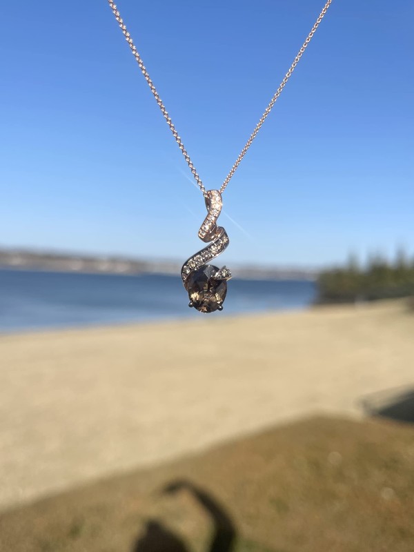 • ELEGANT SIMPLICITY - This glamorous handcrafted 14 karat rose gold pendant necklace by LeVian features a cut and polished Chocolate quartz with an original checkerboard cut nestled inside the curve of a ribbon shape. An 18 inches long chain accompanies the pendant