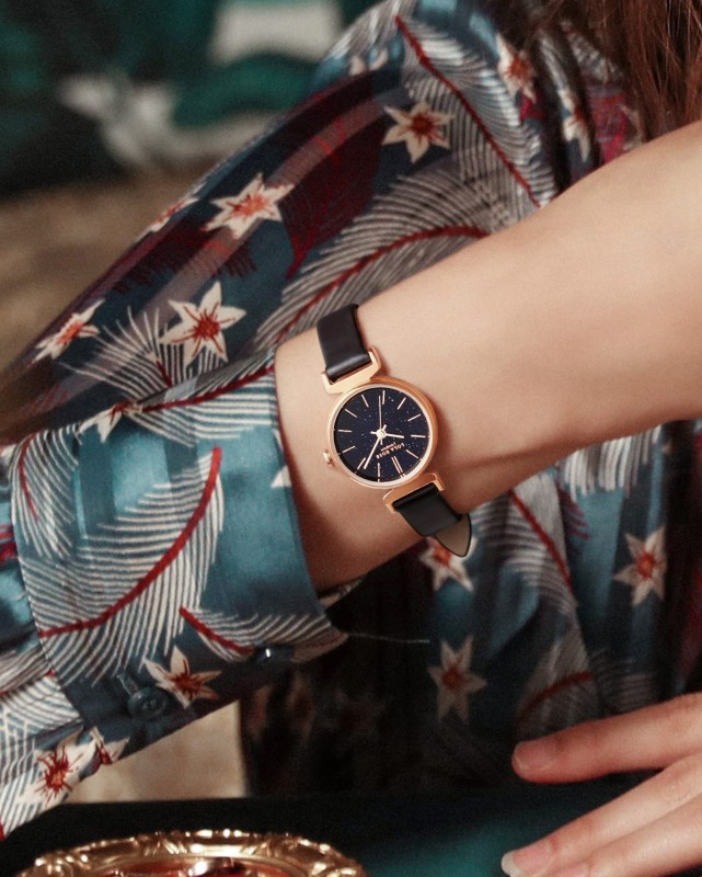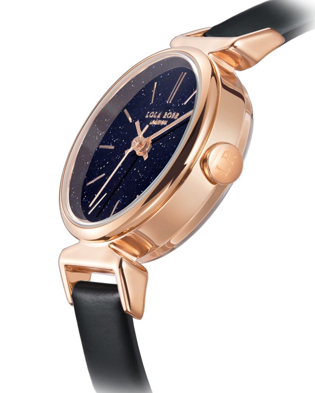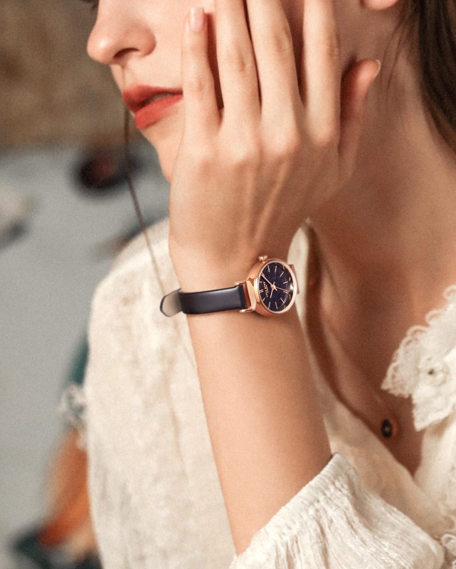 The compact and simple design gives a feminine quality to the overall body. The uncomplicated shape and the low-key blue sandstone dial display a feminine temperament of both liveliness and elegance. The flickering blue light in the blue sandstone dial resembles a vast starry sky in the dark night, offering elements of mystery and depth.
