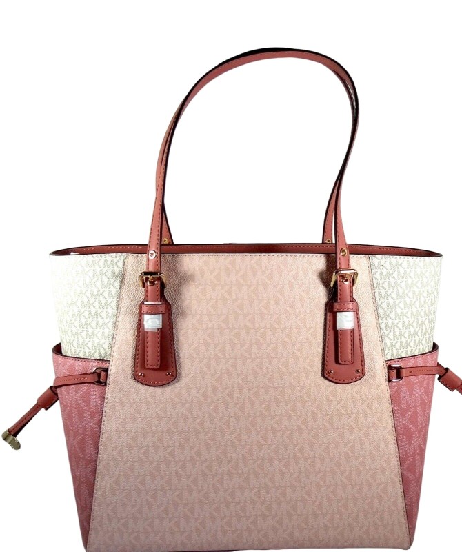 The MICHAEL Michael Kors Voyager East/West Tote features a leather exterior, dual flat top shoulder straps, side exterior slip pockets, and brand name hardware at the front.